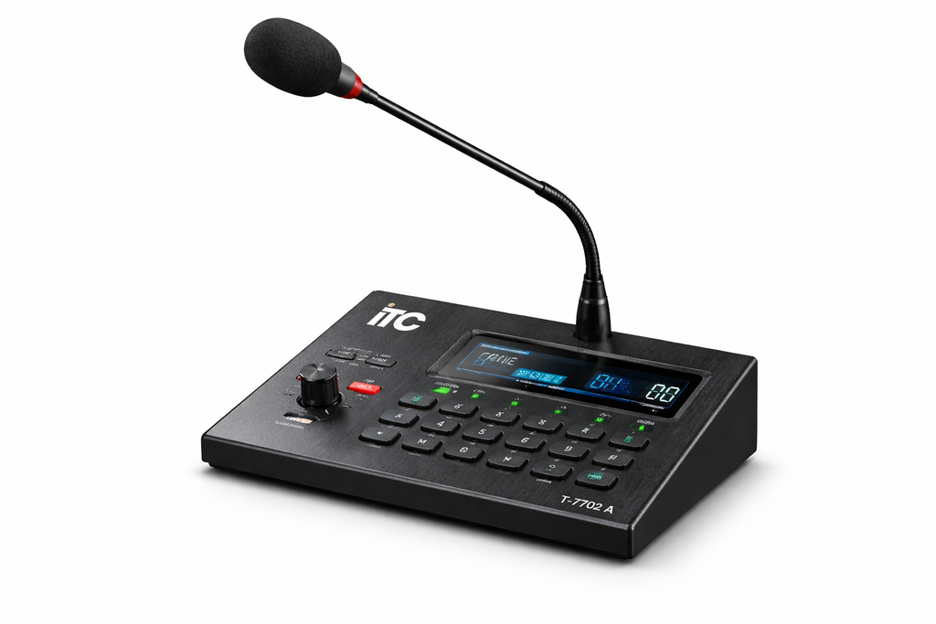ITC T-7702A là bàn gọi (paging microphone) chuyên dụng thuộc hệ thống âm thanh thông báo của ITC. Thiết bị cho phép người dùng thực hiện thông báo trực tiếp đến từng khu vực hoặc toàn bộ hệ thống một cách nhanh chóng, rõ ràng và chuyên nghiệp.