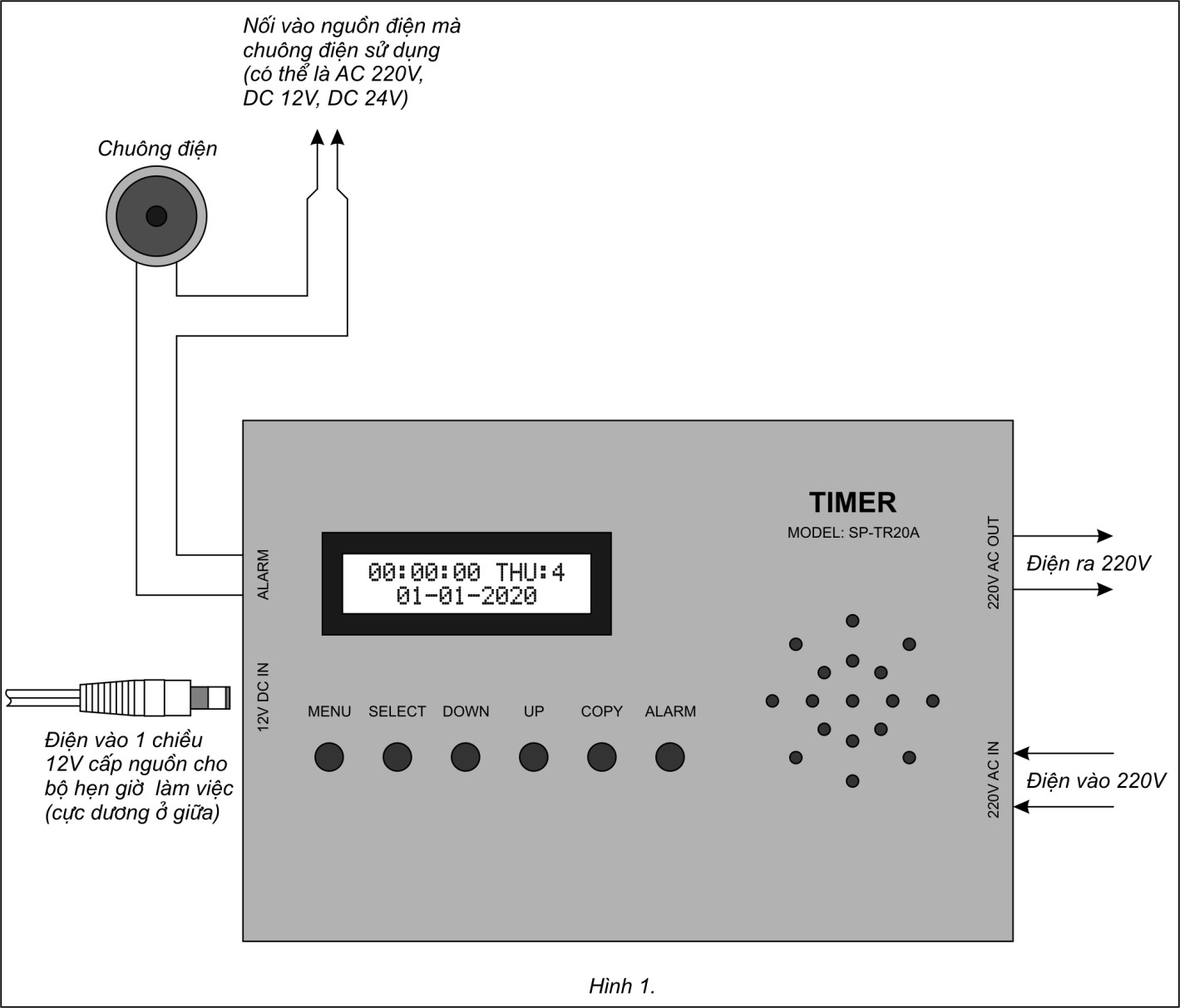 - Đấu nối với chuông điện bằng cách bắt vít vào ổ ở phía sau của bộ hẹn giờ.