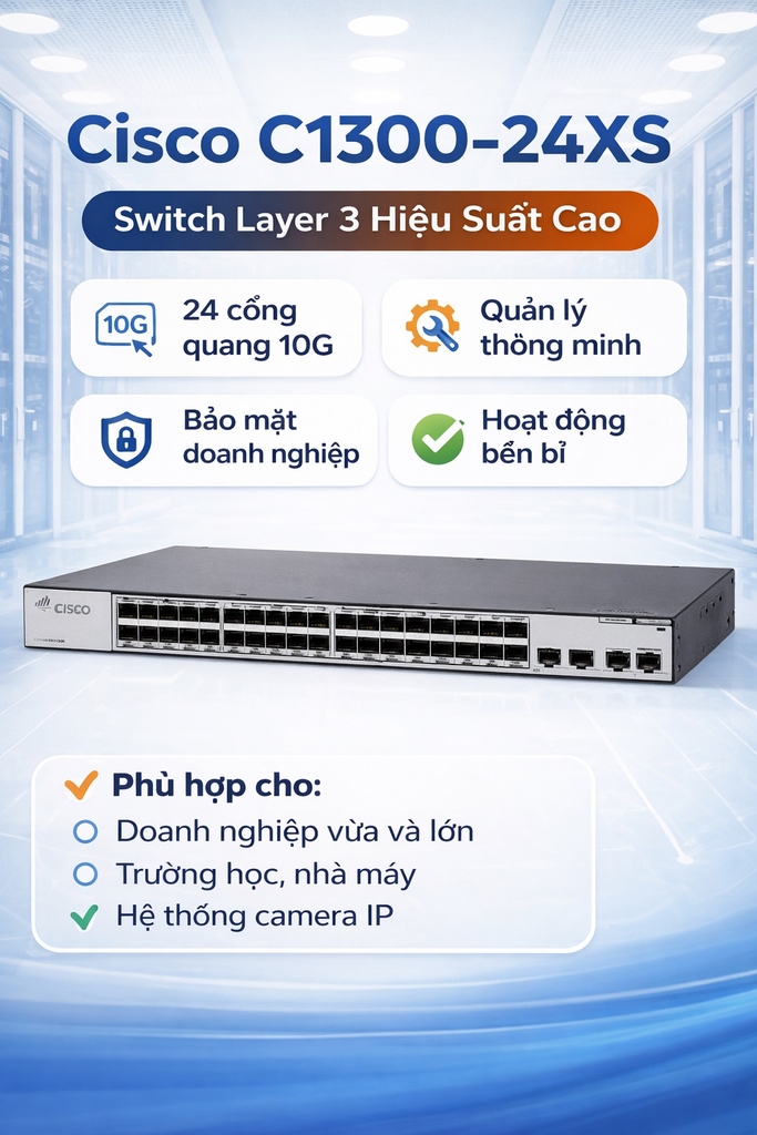Với hiệu năng mạnh mẽ, khả năng quản trị linh hoạt và độ bền cao, Cisco C1300-24XS là lựa chọn lý tưởng cho văn phòng, tòa nhà, trường học, nhà máy và hệ thống camera IP chuyên nghiệp.