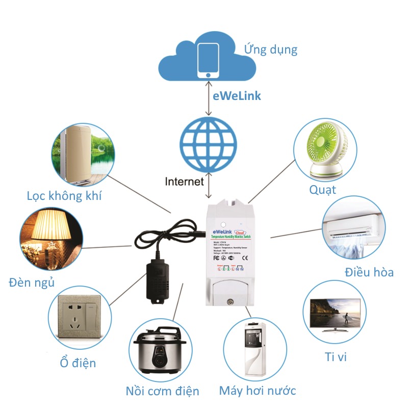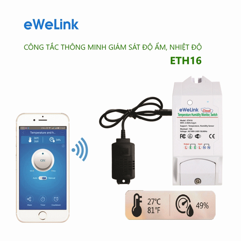 Bạn có thể sử dụng đầu dò với các thiết bị, công tắc WiFi thông minh như ETH10, ETH16 để giám sát và điều khiển tắt mở thiết bị theo các giá trị tham số từ đầu dò.