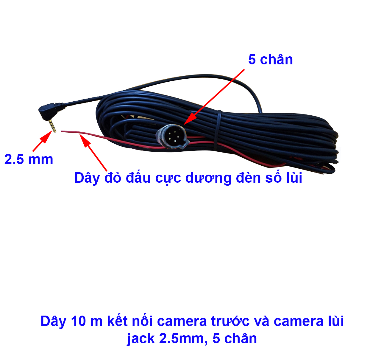 Camera hành trình trên thị trường dây kết nối camera trước với camera sau thường dài 5.5m, chiều dài này chỉ đủ cho xe con và xe bán tải, còn với xe tải độ dài này là không đủ, chúng tôi mang tới giải pháp dây kết nối camera hành trình trước và camera sau dài 10m chuẩn kết nối chung với jack kết nối camera hành trình trước là 2.5mm, kết nối với camera sau là jack 5 chân. Độ dài này vừa đủ để cho tín hiệu rõ nét, không bị giật hình. Dây có đủ 1 dây kết nối với cực dương của đèn số lùi, dây này có nhiệm vụ kích hoạt toàn màn hình camera sau, có thang chia khoảng cách.