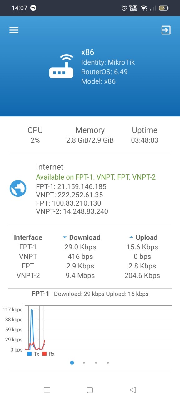 2. Quản lý đường truyền internet: quản lý, gộp đường truyền trên một router, server, tự động gộp tốc độ đường truyền của các nhà mạng như VNPT, FPT, Viettel(lên lắp nhiều đường truyền của các nhà mạng tránh tĩnh trạng phụ thuộc một nhà mạng). Khi có một đường truyền có vấn đề lập tức hệ thống sẽ cảnh báo qua mail cho người quản lý.