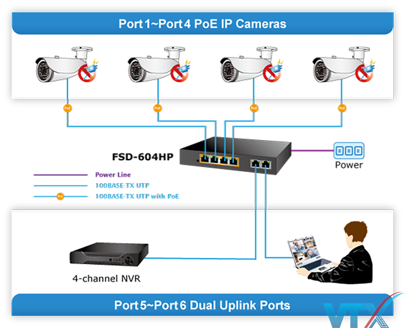 Switch chia mạng Planet FSD-604HP được trang bị 4 cổng PoE 802.3at + 2 cổng 10/100TX dùng để phục vụ cho các mạng giám sát IP quy mô nhỏ. Với các cổng 10/100BASE-TX, các tệp video HD được ghi từ 4 camera IP PoE cung cấp bởi Switch FSD-604HP được lưu trong hệ thống NVR 4 kênh. Phần mềm giám sát của FSD-604HP thực hiện giám sát an ninh toàn diện và quản lý hệ thống giám sát trong mạng LAN cục bộ hoặc trang web từ xa thông qua Internet.
